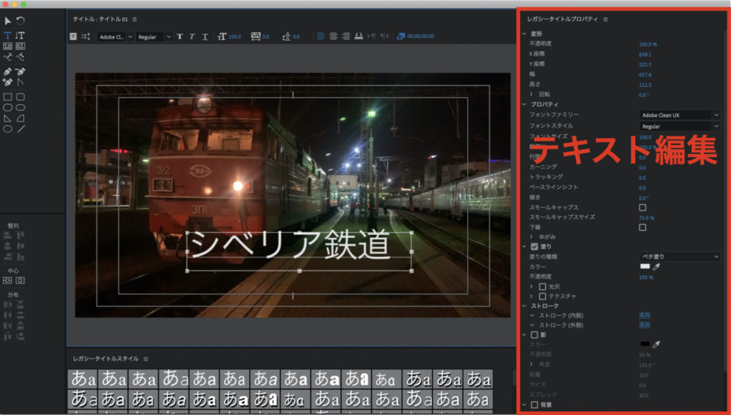 レガシータイトルウィンドウの右側にある「レガシータイトルプロパティ」で編集します。